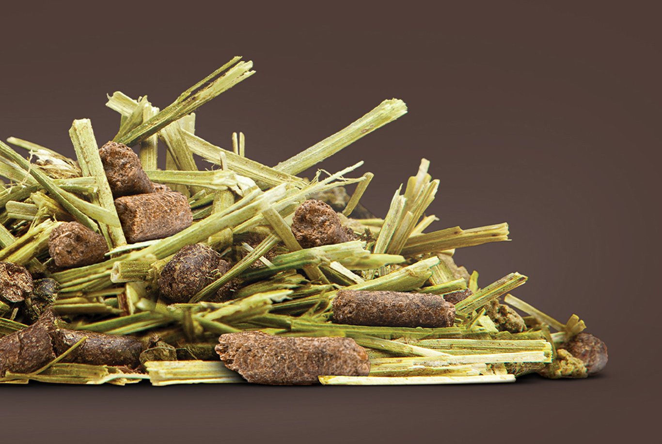 flax chaff pellets, alfalfa stems, alfalfa pellets, expanded flaxseed, expanded vegetables, linseed oil, yeast, galacto-oligosaccharides, mannan-oligosaccharides, fructo-oligosaccharides, biotin.