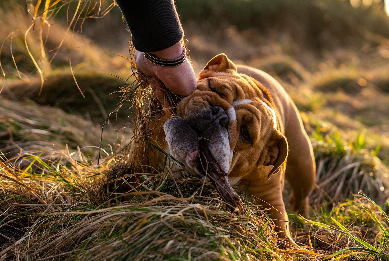 Bulldogs naturlige instinkt er å underkaste seg lederen av pakken - du må etablere denne posisjonen for deg selv så tidlig som mulig. Tidlig sosialisering av denne rasen vil sikre riktig oppførsel med mennesker og andre dyr i fremtiden. Denne hunderasen elsker å tygge på ting, så du bør alltid gi den et tyggeleke av høy kvalitet, som Tugg Plus fra Husse-serien som er 100% naturlig og hjelper til med mekanisk tannrengjøring. Bulldogs elsker å spille dragkamp, noe som kan være en fin måte å lære valpen din å frigjøre alt som er i munnen hans på kommando. Bulldog valper er ganske aktive spisere og kan gå lett opp i vekt - du bør alltid overvåke vekten av valpen din. Siden de trenger relativt store mengder mat for kroppene i vekst, anbefales det å sette den anbefalte mengden mat i flere mindre måltider. Ettersom valper har små mager, er det det beste valget å tilby mat av høy kvalitet som er rik på næringsstoffer, siden et mindre volum fôr gir valpen din alle komponentene som trengs for sunn utvikling. Valp Plus vil fungere bra for valper av denne rasen.