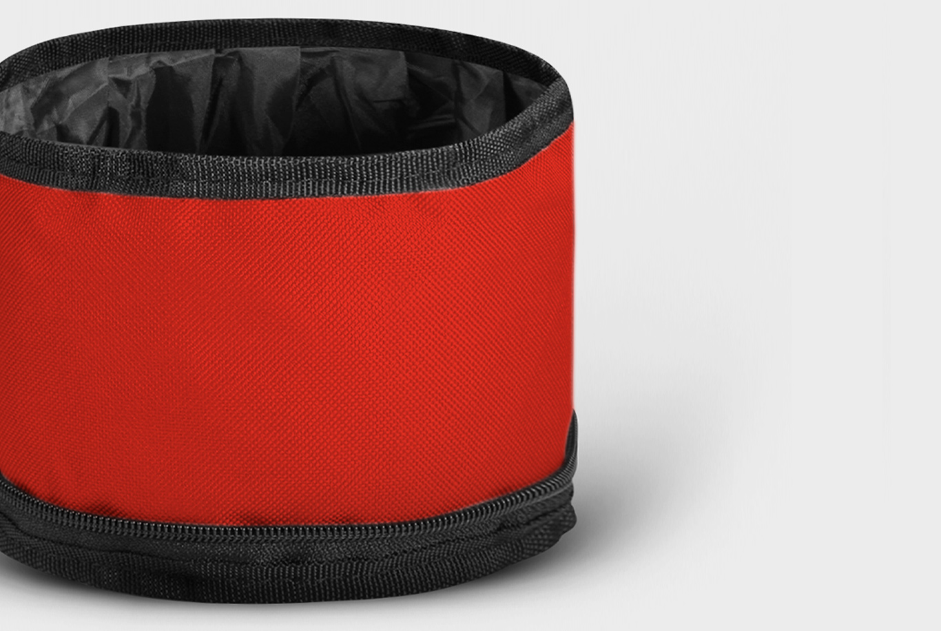 Sammenleggbar reiseskål laget av slitesterkt vanntett nylonmateriale.